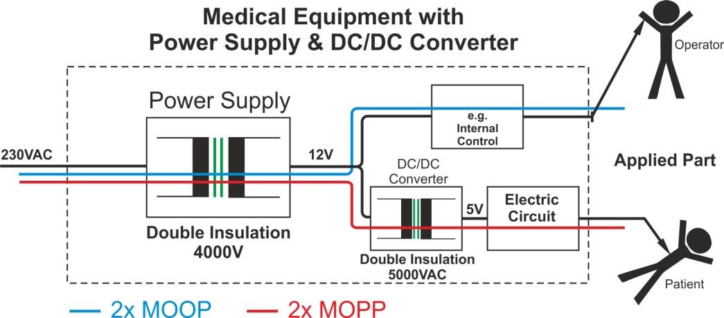 The primary requirements for 2 x MOPP (Figure 1) are 4000 V AC isolation, 8mm creepage distance and double insulation. Most commonly available DC/DC converters (including those that carry EN60950 approval) offer between 500 V DC to around 1600 V DC of isolation and are, therefore, not suitable for medical applications. However, specialised DC/DC converters are available that will meet the requirements for AP when used in conjunction with such standard off-the-shelf power supplies.